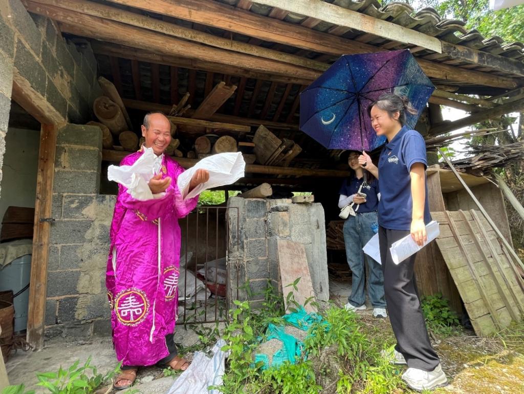 “这么多年轻人来看我这个老头子啊,快坐快坐,我烧开水给你们泡蜂蜜。”已经70多岁的汉戏传播人杨宏忠满脸笑意地迎接2025年新澳门原料网站研究生宣讲团暑期专业实践团(以下简称“实践团”)。团队成员对其进行了深入采访,了解他唱地方汉戏的故事。采访中,杨宏忠热情介绍了过去村里逢年过节表演汉戏的热闹盛况,并即兴给实践团表演了一段出征的戏曲腔调,带领团员们共同参观了他宝贝了多年的戏服。杨宏忠表示,汉戏是芷江当地一大历史悠久的民俗特色,但是现在唱汉戏和学汉戏的人越来越少了,他也希望能够将这份文化瑰宝不断发扬光大:“只要有人愿意学,我都愿意教。”