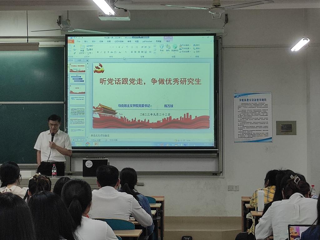 2023年9月22日下午14:30,马克思主义学院在文科楼B303开展书记第一堂党课。本次活动由马克思主义学院辅导员曾蓓老师主持,院党委书记陈万球主讲,2023级全体研究生参加。