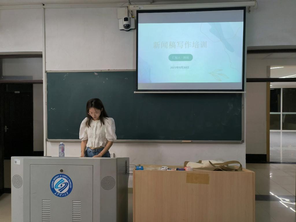为进一步提升马克思主义学院新闻宣传队伍的新闻写作和对外宣传工作水平。2023年9月20日晚19:00,我院在文科楼A208顺利举行了新闻稿写作培训交流会,此次活动由辅导员曾蓓老师组织,宣传部姚瑶同学主讲,23级各专业方向负责人共10余人参加了会议。