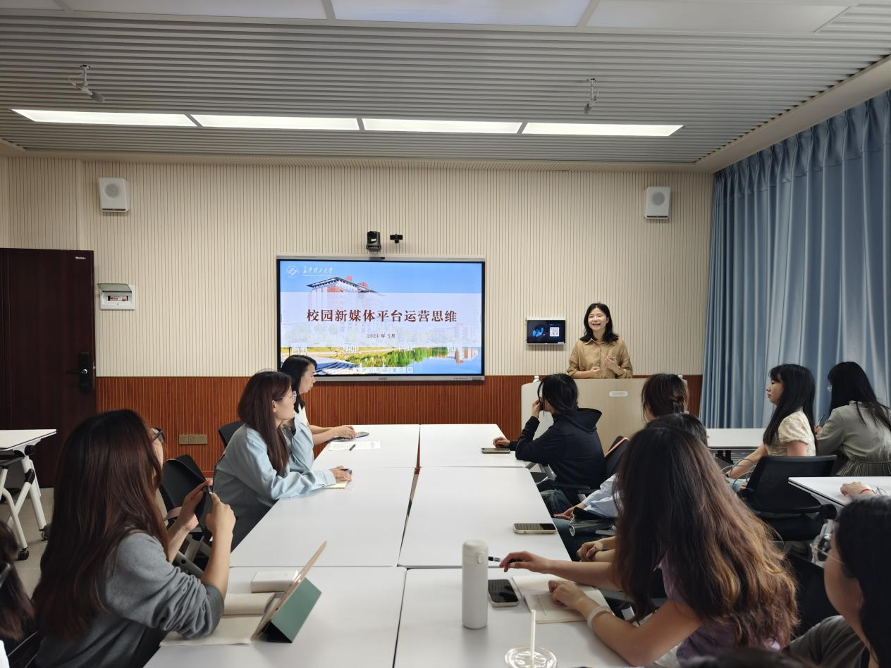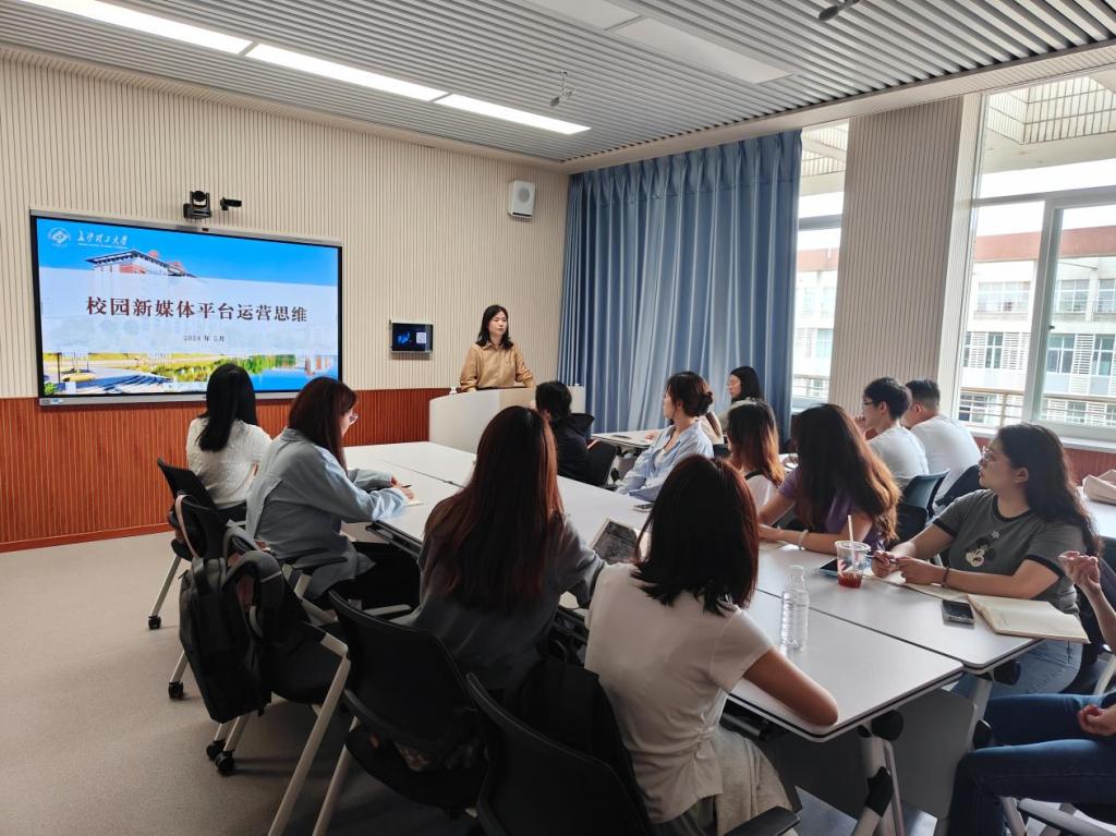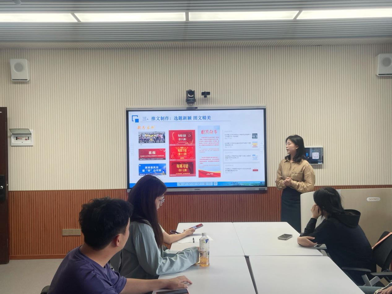 詹佳担任我校四年制辅导员,从事大学生网络思想政治教育,负责运营学校易班发展中心及“长理学贝”等网络平台。在培训会上,她结合个人在新媒体运营上的丰富经验,深度解读了内容产出的三大思维、新媒体策划的重点选题、微信排版技巧、新闻标题和导语的撰写要点,以及如何做好团队打造等方面。她强调,在内容为王的时代,要深入群众、找好角度、善于描绘生动的细节,才能创作出受众喜欢的新媒体作品。在交流环节中,詹佳针对我院微信公众号和学院官网提出了实用性指导和针对性建议,并鼓励学院新闻宣传工作者围绕学院高质量发展和师生实际需求,因地因时制宜,讲述好故事,传播正能量。