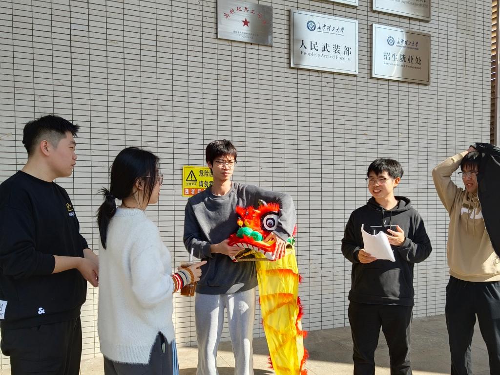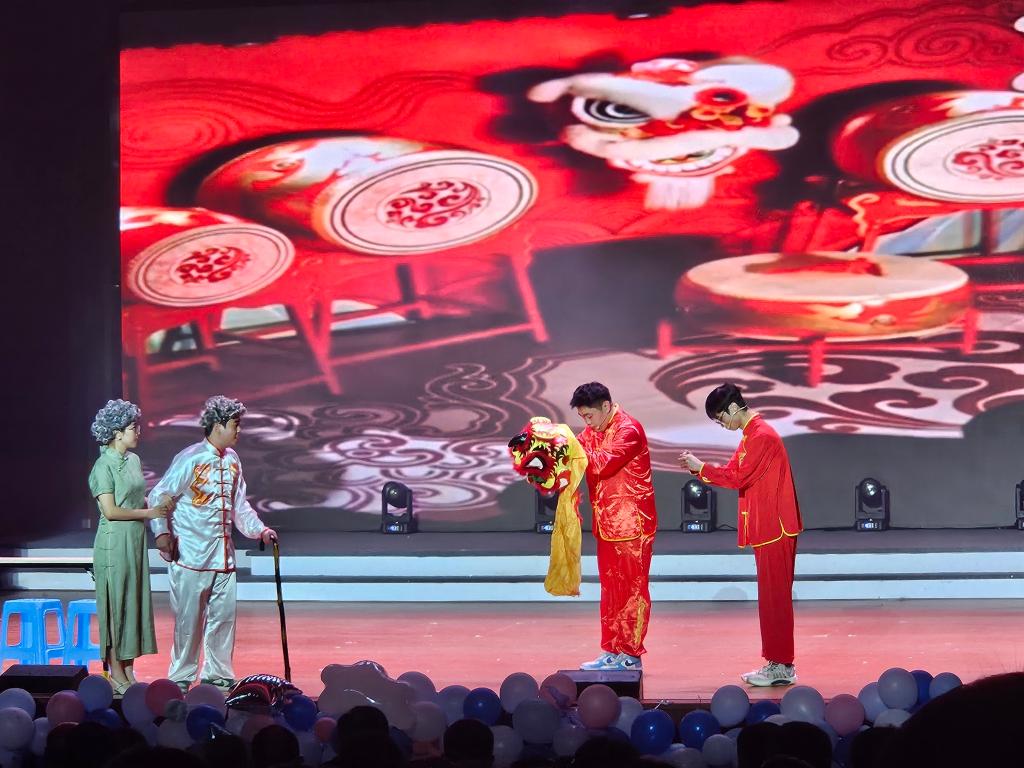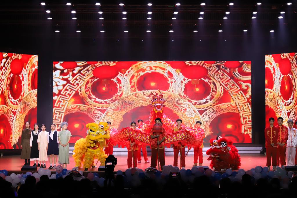 在此次晚会中,马克思主义学院协同计算机与通信工程学院为大家带来节目《遗艺生辉,龙翔狮瑞》。整个节目由情景剧和舞龙舞狮两个部分组成,前半部分的情景剧由马克思主义学院刘妙、石江威、朱国源、姜东、何瀚楠、张露尹、陈红、王思雅、陈俞江、董曼怡和丰子涵十一位同学共同参演,主要讲述了李氏师门坚持传承舞龙舞狮,却收入微薄,难以维持生计,大徒弟李狮子(朱国源饰)因此心生退意,离开师门。在他另寻出路时,却偶遇另一位传承人大王(石江威饰)免费表演舞龙舞狮,通过和大王对话,李狮子再次领悟了舞龙舞狮的使命和价值,最终重返师门。这一故事,展现了非遗文化在现代社会传承时所面临的困境,同时,也让大家意识到,非遗文化是中华民族的宝贵财富,要珍惜、尊重,让它们在现代社会中焕发出新的光彩。
