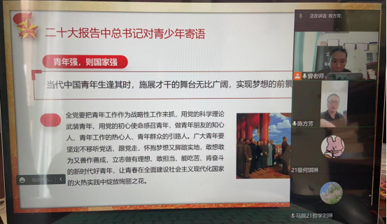 2023年3月7日下午2点,马克思主义学院2021级研究生于线上召开“青春践行二十大”主题班会。此次班会由马克思主义学院辅导员曾蓓老师主持,班主任陈方芳老师、罗月嫦老师、叶再兴老师以及2021级全体研究生参加。