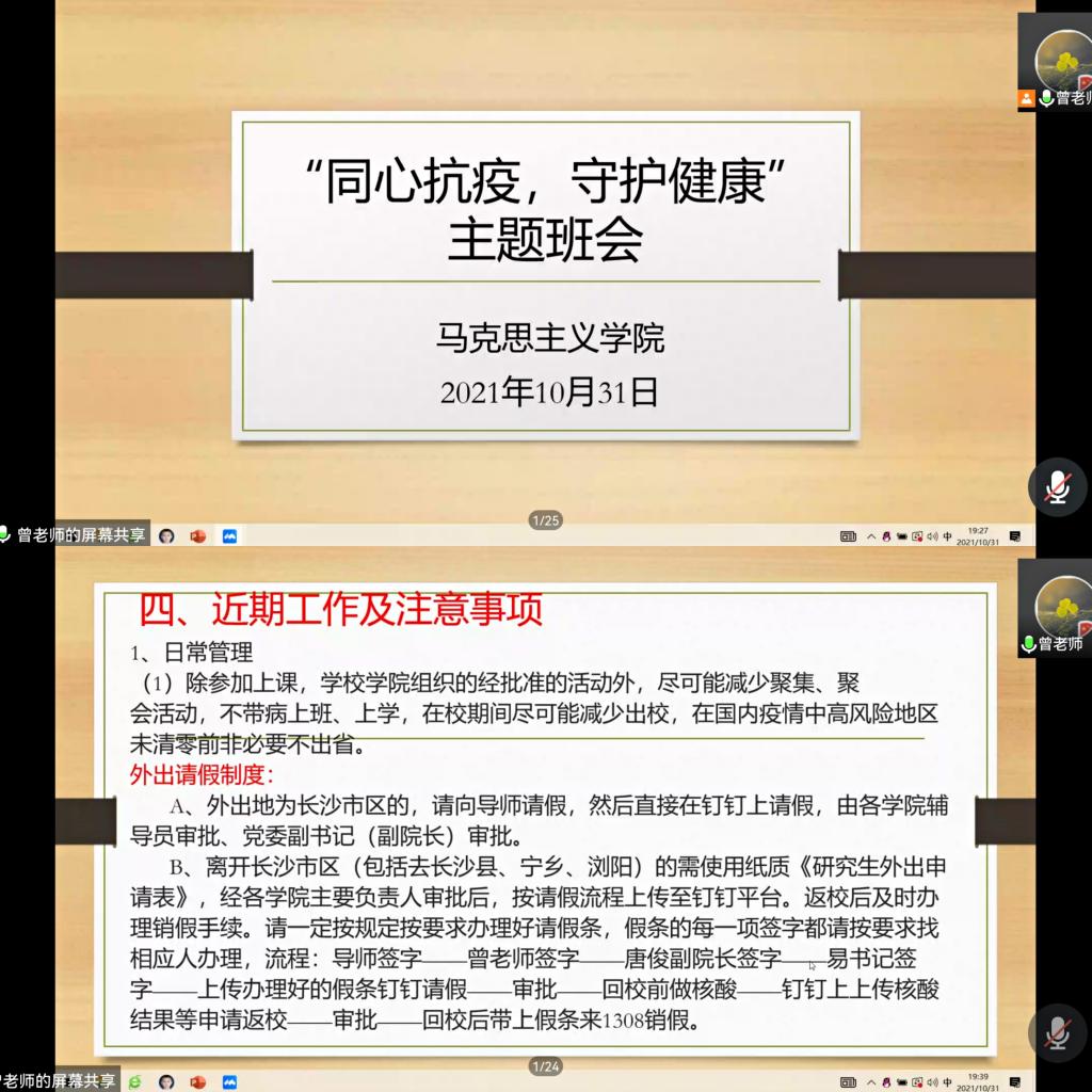 为响应国家、省、市各级政府抗击疫情的号召,全力配合疫情防控工作,强化防疫常态化意识。马克思主义学院于10月31日晚7点20分召开全院全体学生线上主题班会。本次主题班会由辅导员曾蓓老师主讲,副院长唐俊参加。