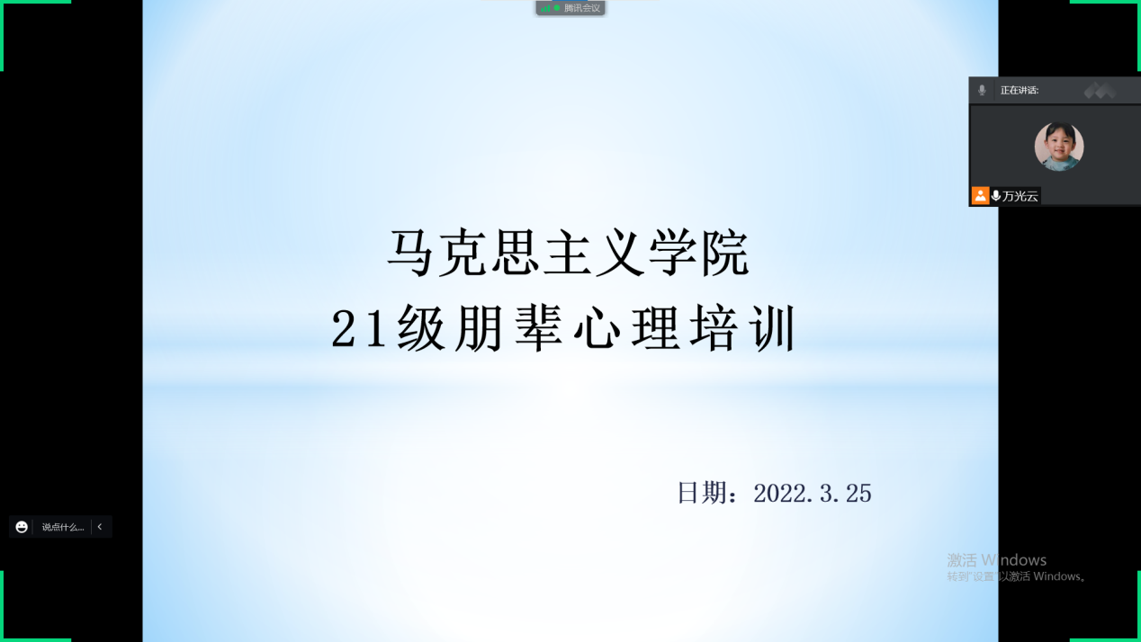 为密切了解同学们的心理状况,及时发现心理问题并妥善解决,3月25日晚,由心理部成员万光云主讲,马克思主义学院21级全体寝室长、专业负责人及各班长参加本次朋辈心理知识培训活动。出于防疫要求,本次会议方式为线上腾讯会议。
