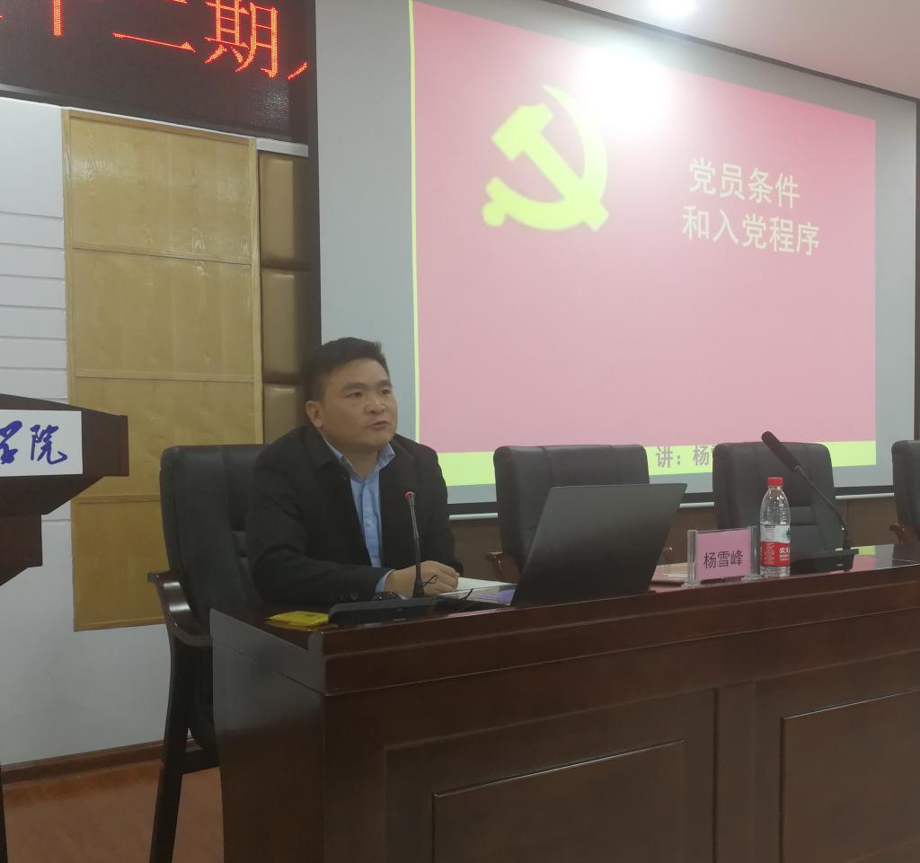 开班仪式后由杨雪峰为积极分子上第一节党课,主题为《党员条件与入党程序》。课上杨雪峰提出了三个问题:1.上高中时学生为什么不能入党?2.比尔·盖茨能加入中国共产党吗?3.马云能不能加入中国共产党?随后他详细讲解党员条件,讲解过程中列举了许多事例并依次解答了上述三个问题。他表示,作为一名共产党员,要有奉献精神,树立全心全意为人民服务的意识;要不怕吃苦、不怕吃亏、敢于牺牲,并结合学生党员的实际情况为同学们一一列举。最后,杨雪峰预祝各积极分子早日入党,为党的事业做贡献,并树立正确目标,成为对国家、对社会、对家人有用的人。