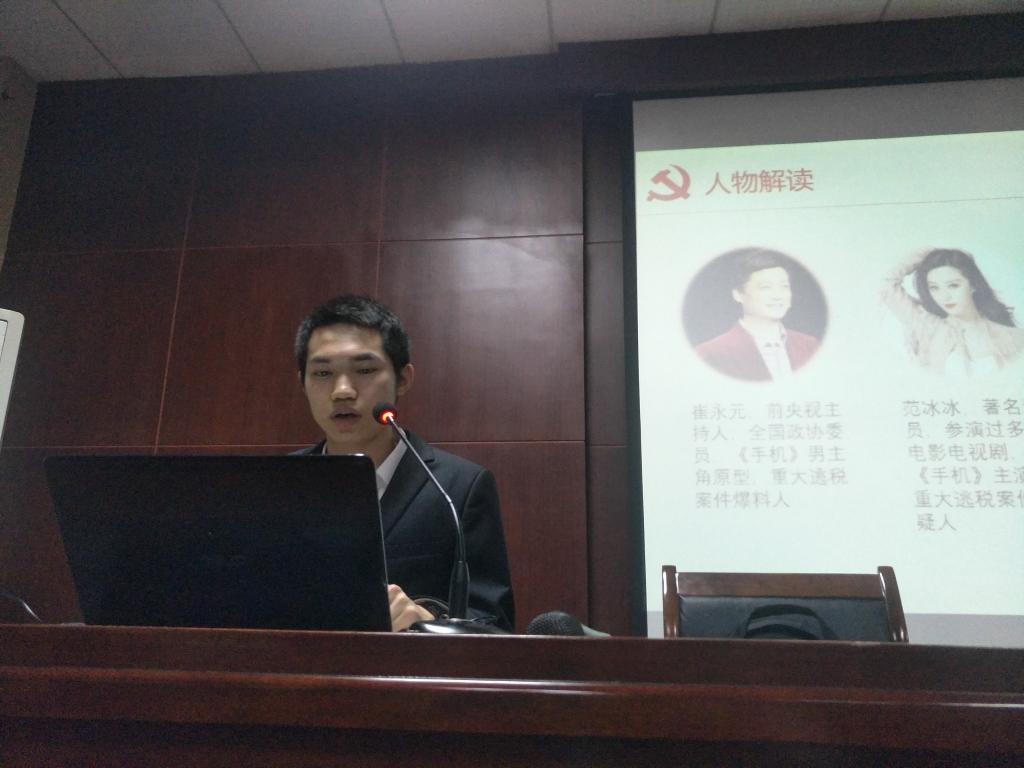 首先,唐博组织全体观看“新闻直播间”关于范冰冰逃税漏税案的报道视频,介绍此事件的基本情况。然后,他从解读本事件中涉及的人物入手分析事件始末,从微博爆料到央视关注再到公众热议,范冰冰案一步步水落石出、处罚结案。接下来,他讲解了明星收入来源以及逃税手段,并列举了毛阿敏、刘晓庆此前的逃税事件。范冰冰案折射出了当今社会存在的几个问题:社会公众人物操守问题、居民贫富差距过大、社会分配不公以及税收征管问题。最后,唐博提及屡次刷屏的娱乐事件,并播放三大飞机总设计师杨伟、唐长红、赵霞同台朗诵诗歌《致远方》的视频。娱乐圈明星不顾法律与道德操守是对社会资源的极大浪费,各同志要引以为戒,谨记“全面从严治党在路上”。