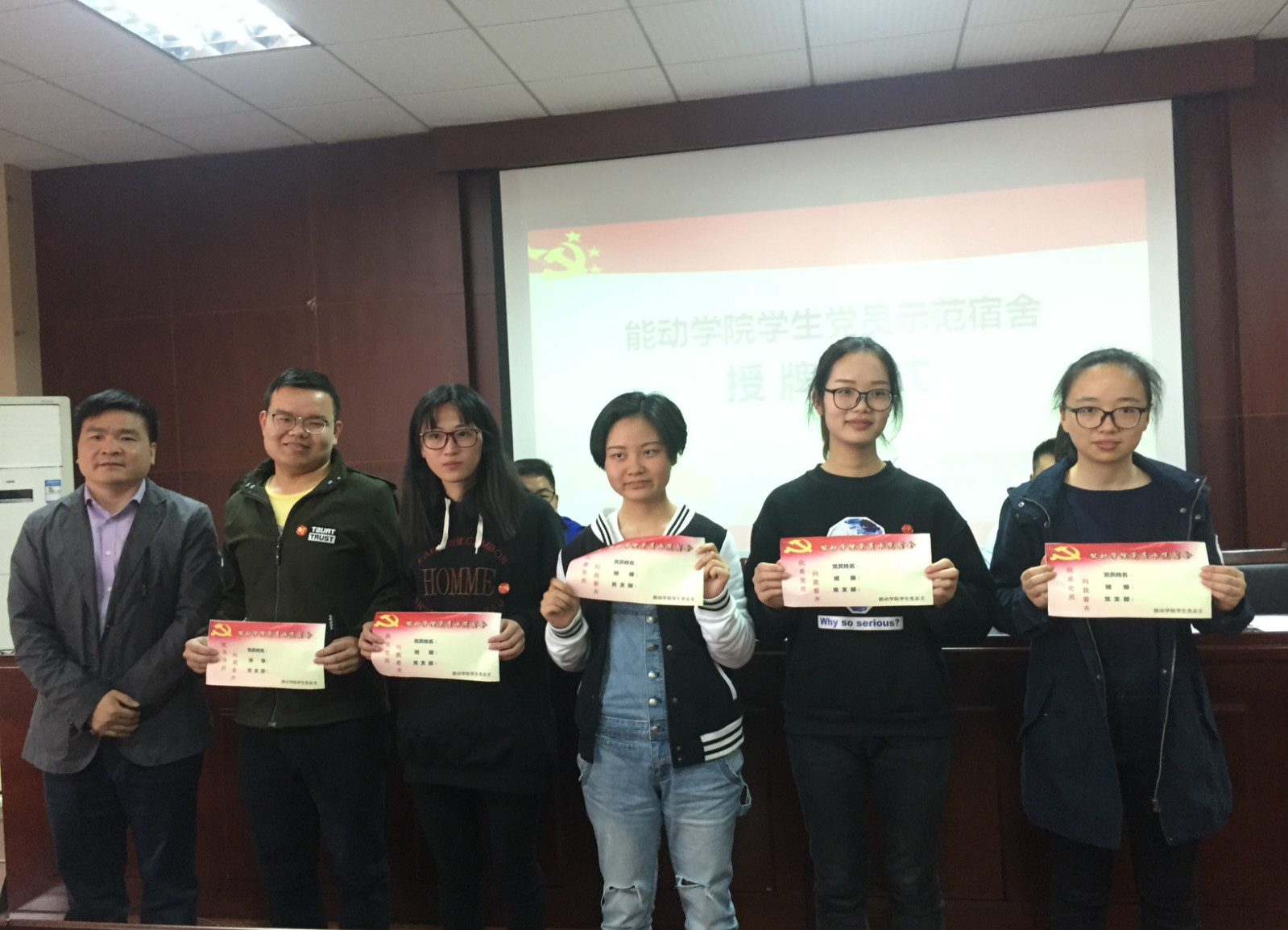 最后,李小军老师强调:“全体学生党员要牢固‘从我做起、向我看齐、对我监督’的意识,再接再厉,共同创建文明宿舍,发挥好学生党员在宿舍先进文化建设中的先锋模范作用,发挥好优秀宿舍在学生思政工作中的窗口作用。”