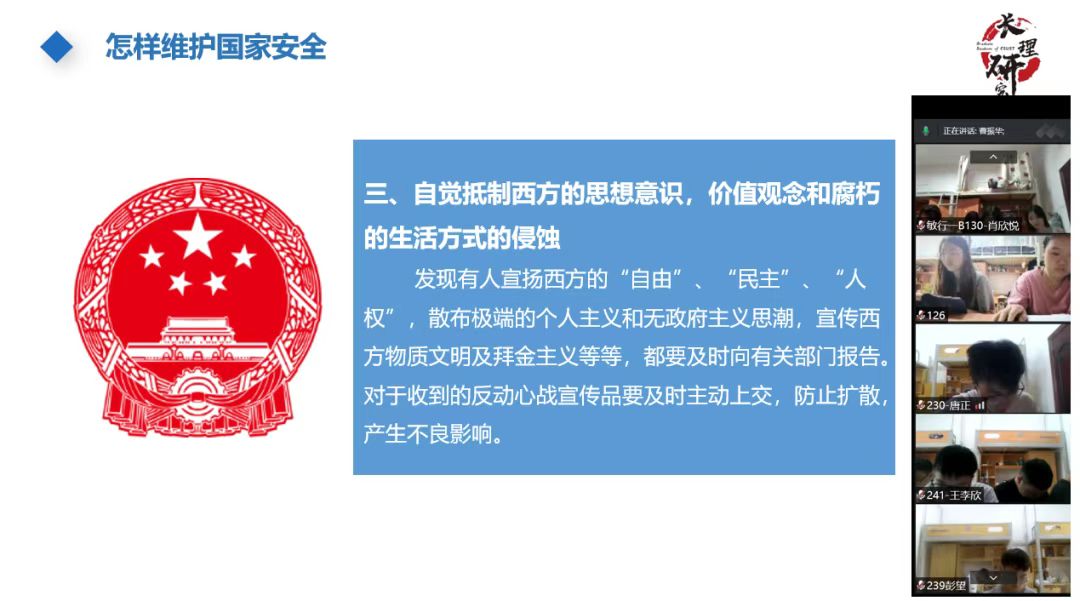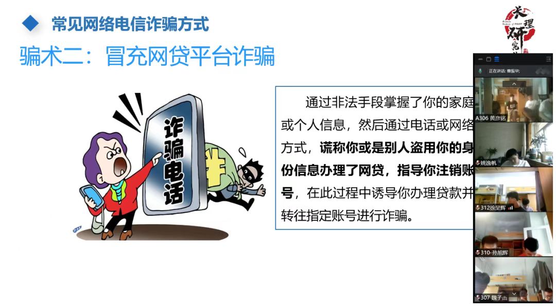 曹振华带领新生共同学习了《研究生入学安全教育》,用案例对新生的人身安全、财产安全、消防安全、食品安全、国家安全、网络安全、心理健康等进行了详细的教育和引导,帮助大家提升安全责任意识,平安健康度过美好的校园生活。