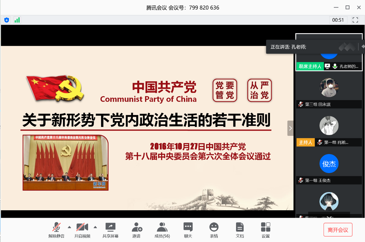 第二次专题党课《关于新形势下党内政治生活的若干准则》(以下简称《新准则》),由交通学院党委书记孔伟红老师主讲。孔伟红首先从历史背景入手,对新旧准则各项条款进行对比性介绍。随后,她结合学院党政工作以及当下新冠肺炎防控工作对《新准则》坚持党的基本路线,严明党的政治纪律,加强对权力运行的制约和监督等十二条具体条款做了深入具体的阐释,让同学们对党内政治生活以及如何成为一名合格的党员有了更深刻地理解。课程最后,她提出了“五个时刻牢记”帮助同学们进一步践行《新准则》。