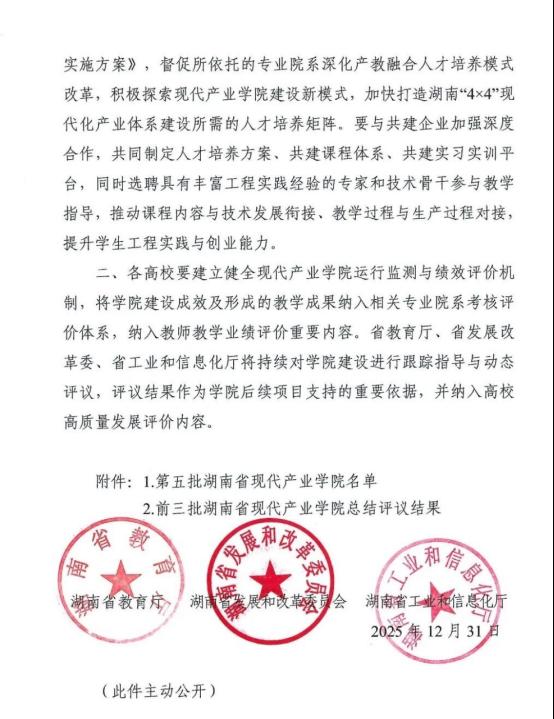 近日,湖南省教育厅公布第五批现代产业学院立项建设名单,我校申报的“智能技术与装备现代产业学院”成功获批。这是学校深化产教融合、服务区域发展的重要成果,标志着学院在新工科建设与产业协同育人方面迈上新台阶。