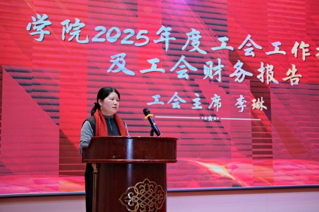 随后,院工会主席李琳作2025年度工会工作报告及工会财务工作报告。报告从服务教职工成长、丰富文体活动等方面进行梳理,总结了工会过去一年的工作成效。