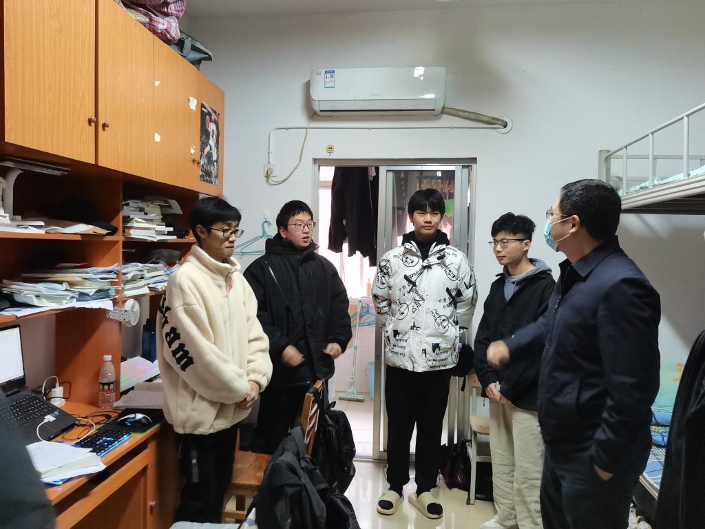 12月3日上午,水利学院院长陈杰、党委副书记银波深入学生宿舍与学生亲切交谈,了解学生思想状态。