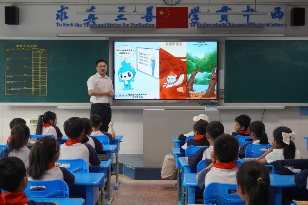 5月26日上午,依托国家自然科学基金科技活动项目“‘守护好一江碧水,共建绿水青山’洞庭湖保护系列科普活动”,水利与环境工程学院师生前往长郡雨花双语小学开展科普活动,为三年级四班的同学们上了一堂生动有趣的“节水课”。本次活动由水利学院院长陈杰主讲。