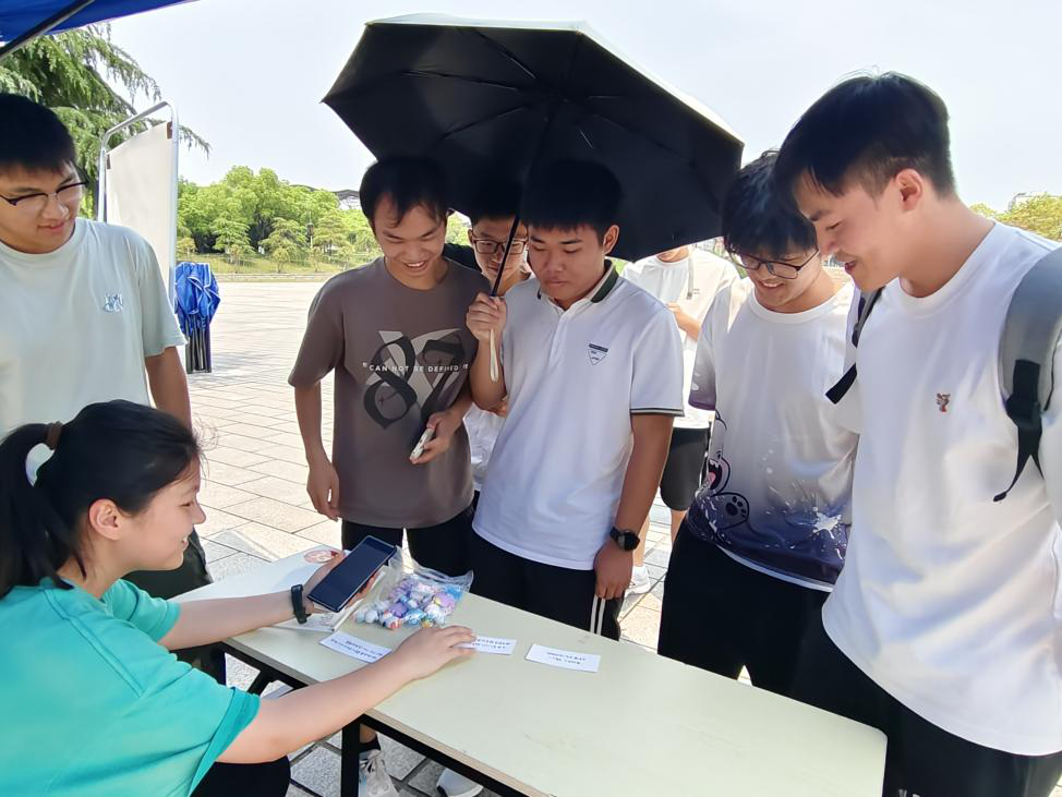活动现场共设八个主题站点,各具特色。“寻宝奇兵”活动在图书馆前坪火热开展,参与者专注寻找隐藏的水文化知识卡片,并现场回答相关问题。知识丰富的同学对答如流,赢得阵阵掌声;认真思考的学子则带动了现场互动氛围,展现了求知若渴的精神风貌。