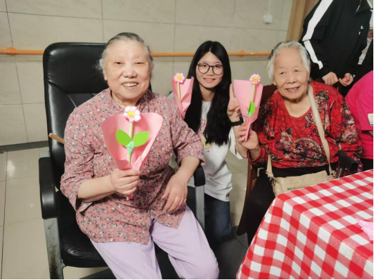 表演结束后,同学们还为老人送上了特殊的礼物——手工制作的母亲节花束。随后同学们与老人亲切交流,倾听过往故事,现场充满温情。水利类2401班陈俊宇说:“这一次志愿活动让我深切地感受到,老人需要的不仅仅是物质上的支持,更需要的是精神上的陪伴和关爱。”