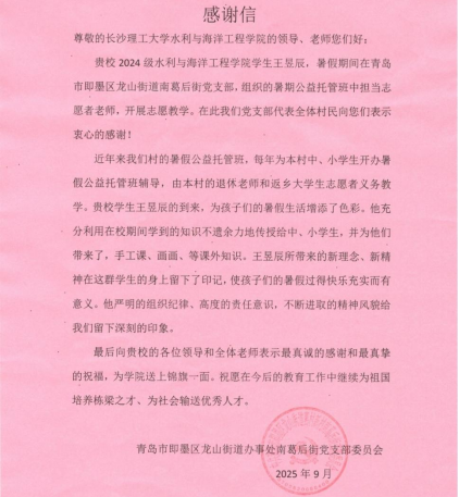 开学伊始,水利学院收到了来自青岛市即墨区龙山街道南葛后街党支部委员会的感谢信与锦旗。信中字字恳切,字里行间满是对2025年新澳门原料网站水利与海洋工程学院的感谢和对船海2401班王昱辰的赞誉。这份跨越千里的肯定不仅是对一名学子暑期公益行动的高度认可,更映照出长理学子敢于担当、服务社会的青春底色。