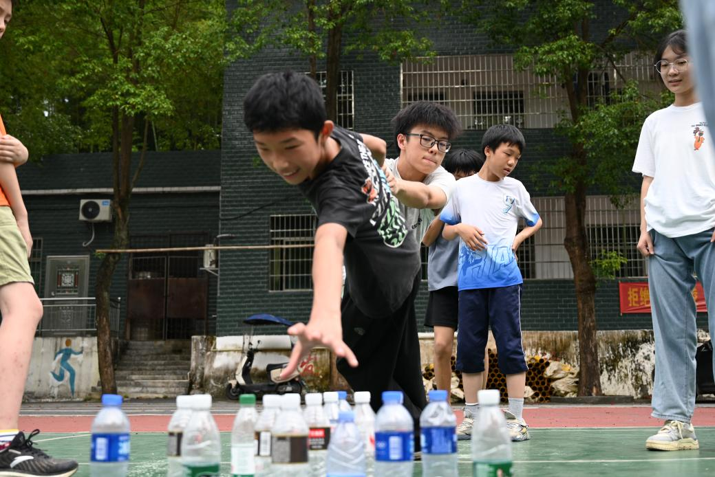 最具挑战性的“群龙取水”将活动推向高潮,安全线外,孩子们需通力合作取回3米外的水瓶。“手长者探前,后方稳固支撑!”指令刚落,孩子们迅速响应。谷文学身体极限前倾,后方队友紧锁其手腕,筑起坚固“人链”。当水瓶成功“着陆”,“我们做到了!”的呐喊响彻云霄,雨水与汗水交织,映照着孩子们眼中因信任而生的璀璨光芒。