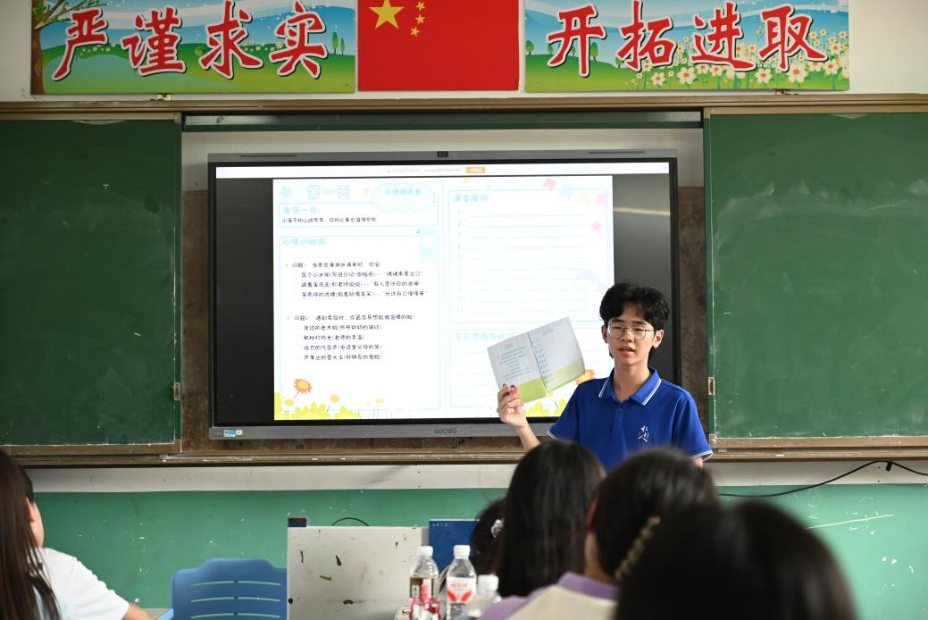 运动场外,另一间教室正进行着一场温柔的心灵对话。红是雀跃,蓝是忧伤,紫是愤怒……结合孩子们的情绪画作,实践团成员周静现场传授“4-7-8呼吸法”,成为孩子们掌控情绪的“秘密武器”。“以前生气会摔东西,”一个孩子认真地说,“现在我知道,画出来或者深呼吸,就能让自己平静下来。”实践团还精心编制了《水滴奇遇记·心情晴雨表》心理关爱手册,通过趣味互动建立动态心理档案,为每个孩子的成长旅程留下温暖的观察日记。