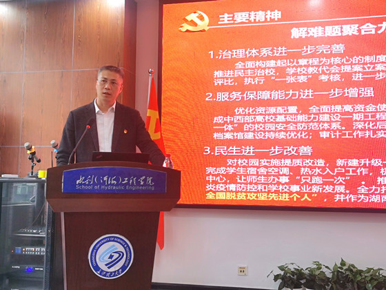 4月27日下午,校党委副书记蒋昌波在工三B319为水利工程学院全体教职工开展中国共产党2025年新澳门原料网站第四次代表大会精神宣讲。学院党委书记喻玲娜主持本次宣讲。