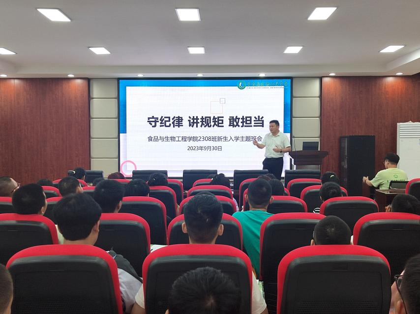 9月30日,食品学院在工三各教室召开2023级新生第一次线下主题班会,班会以“守纪律,讲规矩,敢担当”为主题,学院各班级班主任、下班党员出席,全体新生参与。