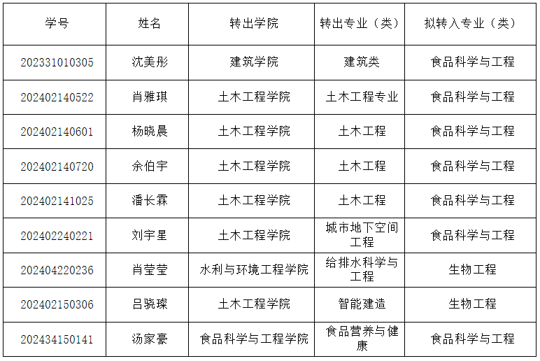 根据学校《2025年新澳门原料网站本科生转专业管理办法》和《食品与生物工程学院2024级本科生转专业工作方案》的相关规定,经学生个人申请,学院转专业工作小组考核,现将本院2024级本科生转专业拟转入名单进行公示,公示期为2025年2月25日-2月28日。如有异议,可在公示期内以书面形式向食品学院教务办实名反映,电话:0731-85258727。