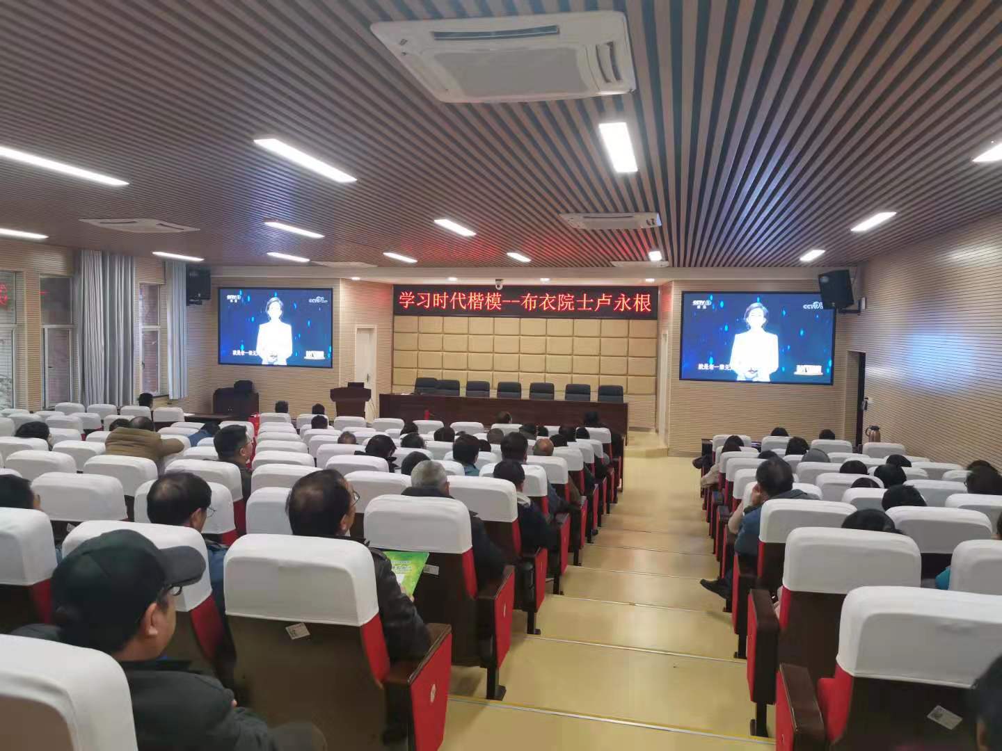 12月17日下午,数学与统计学院组织全体教师在理科楼A200学习“时代楷模”布衣院士卢永根同志的先进事迹。