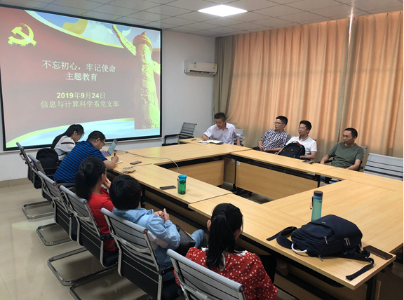 9月24日下午,在理科楼A502,信息与计算科学系组织全系老师开展了“不忘初心、牢记使命”主题教育。学院领导成员龚红仿副院长和仝青山副院长参加会议并开展了调研工作。会议由党支部书记李姣主持。