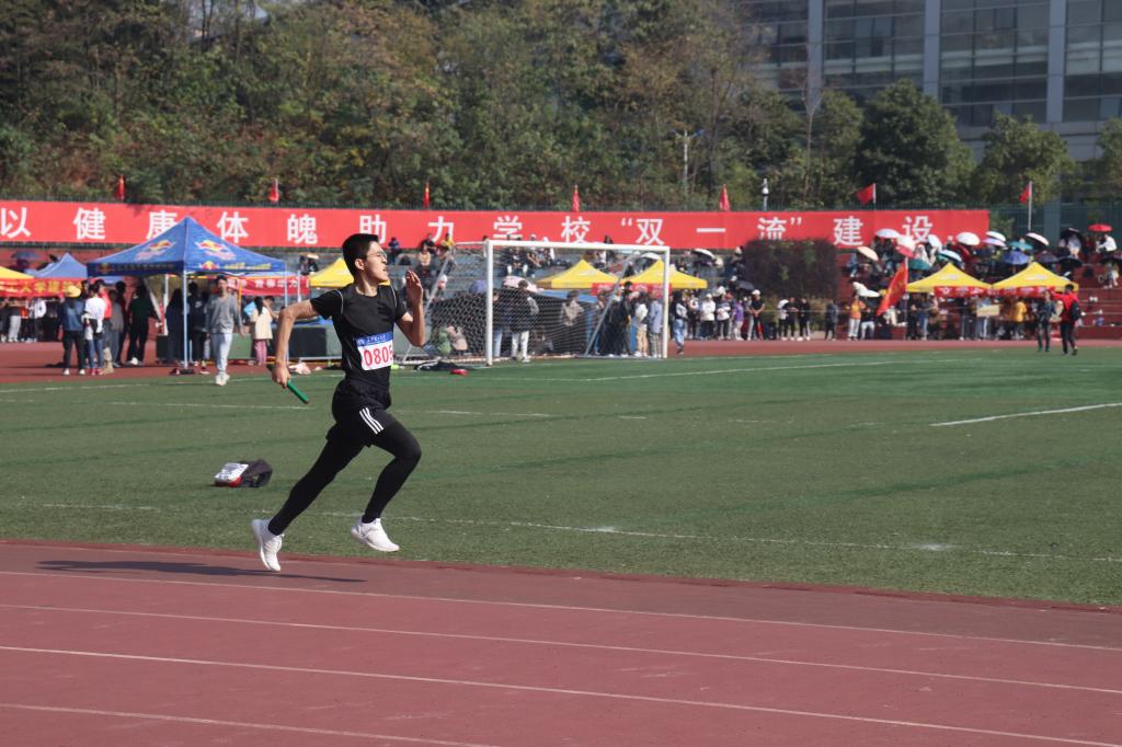 随着发令枪声的响起,学生组200米预赛开始了,运动健儿们拼尽全力,挥洒汗水,在200米的跑道上留下属于他们身影。紧接着的是男子组跳高跳远、女子组三级跳远、铅球比赛以及立定跳远团体赛,他们纵身一跃,不畏惧也不轻言放弃,赛出了数统学院的风采。男子组800米和5000米也随后进行,坚持坚持再坚持是他们的信念。上午的最后一场比赛,男女组4×400米接力在运动健儿们的努力和观众们的呐喊声中结束了。