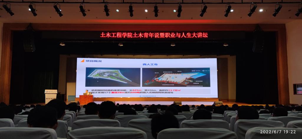 为帮助学生树立专业自信,进一步明确职业规划,6月7日晚上,土木学院在金盆岭校区五教大礼堂举办第五期“土木青年说”暨职业与人生大讲坛,主题为“用不懈奋斗书写青春永不褪色的华美篇章”。学院2010届优秀校友、中交一航局三公司总工程师杨润来应邀主讲。院党委副书记黄阿明、2021级辅导员邓文杰以及全体2021级研究生和本科生900余人参加本次讲座。讲座由土木2109班卢宇轩主持。
