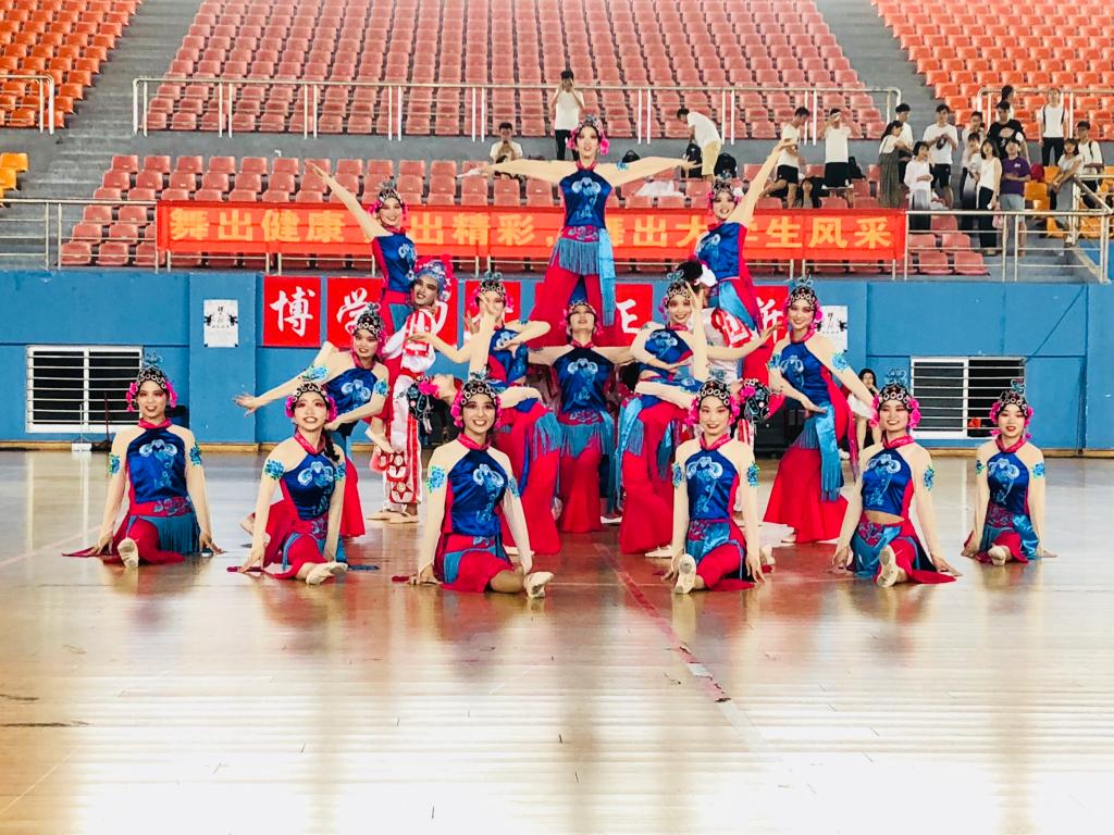 比赛在欢快的氛围中拉开了序幕,跳跃的音符演奏着青春的活力,动人的舞步展现着青春的风影,点燃了全场的热情。第一项器械健身操舞比赛,同学们通过扇子、爵士棍、毛巾、易拉罐、篮球等轻器械进行动作的编排,增加了比赛的趣味性和可看性。第二项排舞比赛,将中国风的《中国脊梁》展现出了铿锵有力而又柔和温婉的特点,表演精彩绝伦,收获了满场的阵阵掌声。在第三项啦啦操的比赛中,显示了大学生们充满活力,时尚、健康向上的美好。大学生优美的舞步成为赛场上靓丽的风景线,各参赛队伍以饱满的激情和活力展现了我校学生蓬勃的朝气与拼搏的力量。