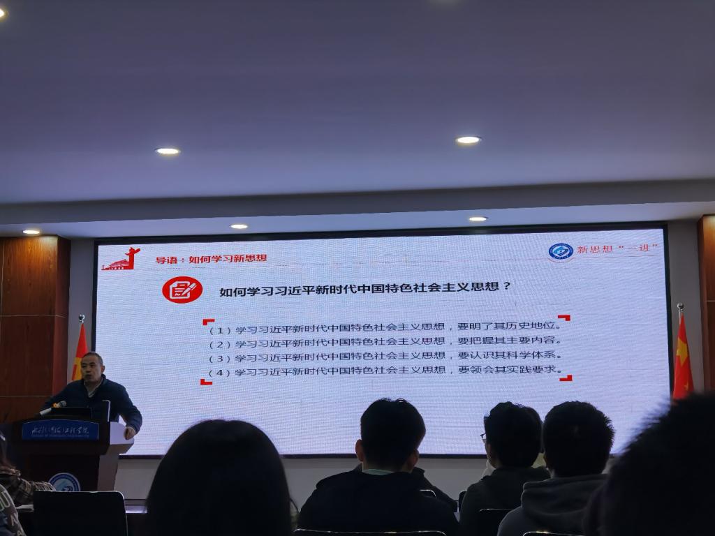 余老师从中国特色社会主义理论的历史地位入手,讲授了“八个明确”与“十四个坚持”,然后介绍了其科学体系,中国特色社会主义思想的奋斗目标、宗旨要求、建设体系与条件保障。最后介绍了实践要求,要强化实践导向,针对现实问题,一定要摆进去。