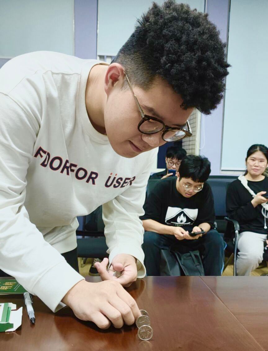 “摆硬币”游戏需要大家上台用尽量短的时间立好四枚硬币,在这个过程中如果有一枚硬币倒下,则需要全部重新开始。经过挑战,高凯鹏同学用时最短,以23秒成绩胜出,他现场分享了经验:良好的心态对事情进展有巨大的作用,硬币倒了重新来没关系,稳住心态是关键。