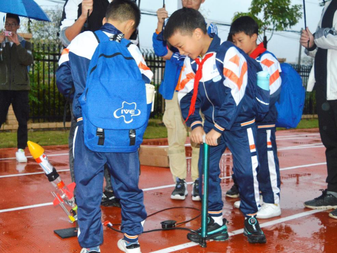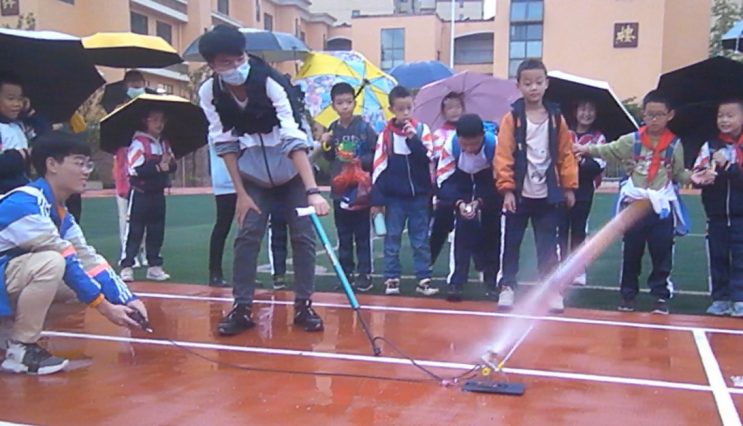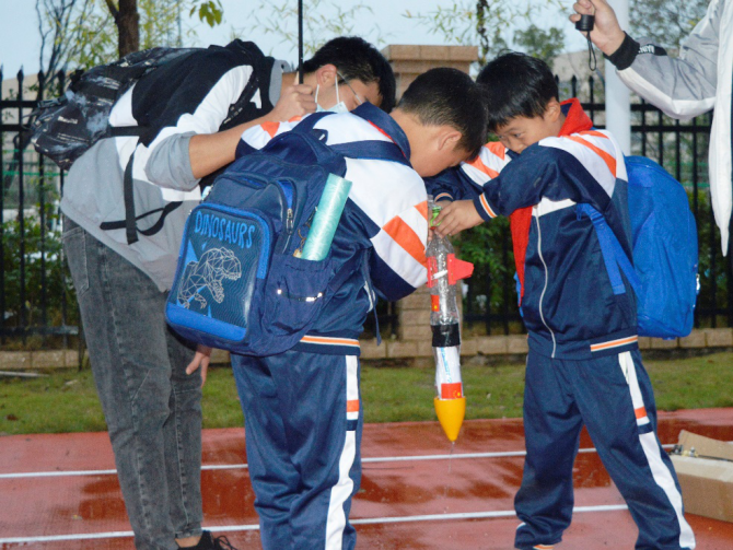 “三,二,一,发射!”在志愿者的帮助下,水火箭顺利发射并在空中分离,同学们的尖叫与欢呼声瞬间响彻整个操场。