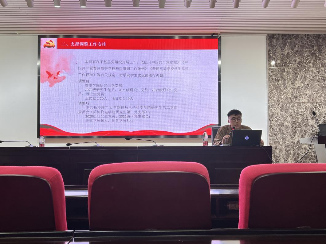 在党课学习结束后由支部书记姚巍同志对支部调整做出说明。本着有利于基层党组织开展工作,依照《中国共产党章程》《中国共产党普通高等学校基层组织工作条例》《普通高等学校学生党建工作标准》等有关规定,对学院学生党支部进行了调整。最后由支部副书记朱瑞祥同志进行党支部近期的工作安排。近期支部主要工作包括“喜迎二十大——物电学院微党课”比赛活动以及发展对象与预备党转正工作。