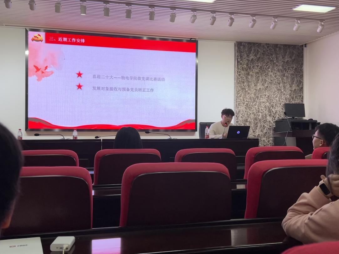 最后由支部副书记朱瑞祥同志进行党支部近期的工作安排。近期支部主要工作包括“喜迎二十大——物电学院微党课”比赛活动以及发展对象与预备党转正工作。