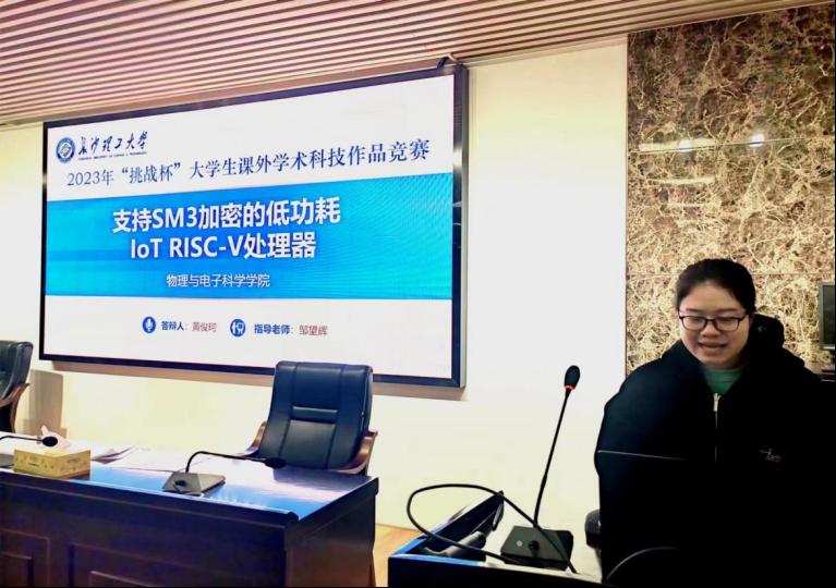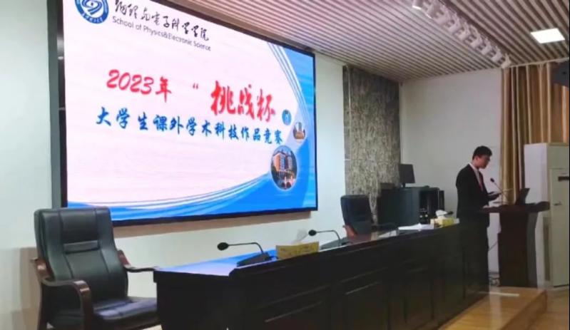 物理与电子科学学院第十八届"挑战杯"竞赛于2023年3月2日晚18:30在理科楼B413举行。本次院赛由院团委学生会彭程远同学主持,邀请到了范志强老师、宾锋老师、卞立安老师担任大赛评委,院党委副书记宋国宁及学工办全体老师也应邀出席了本次大赛。