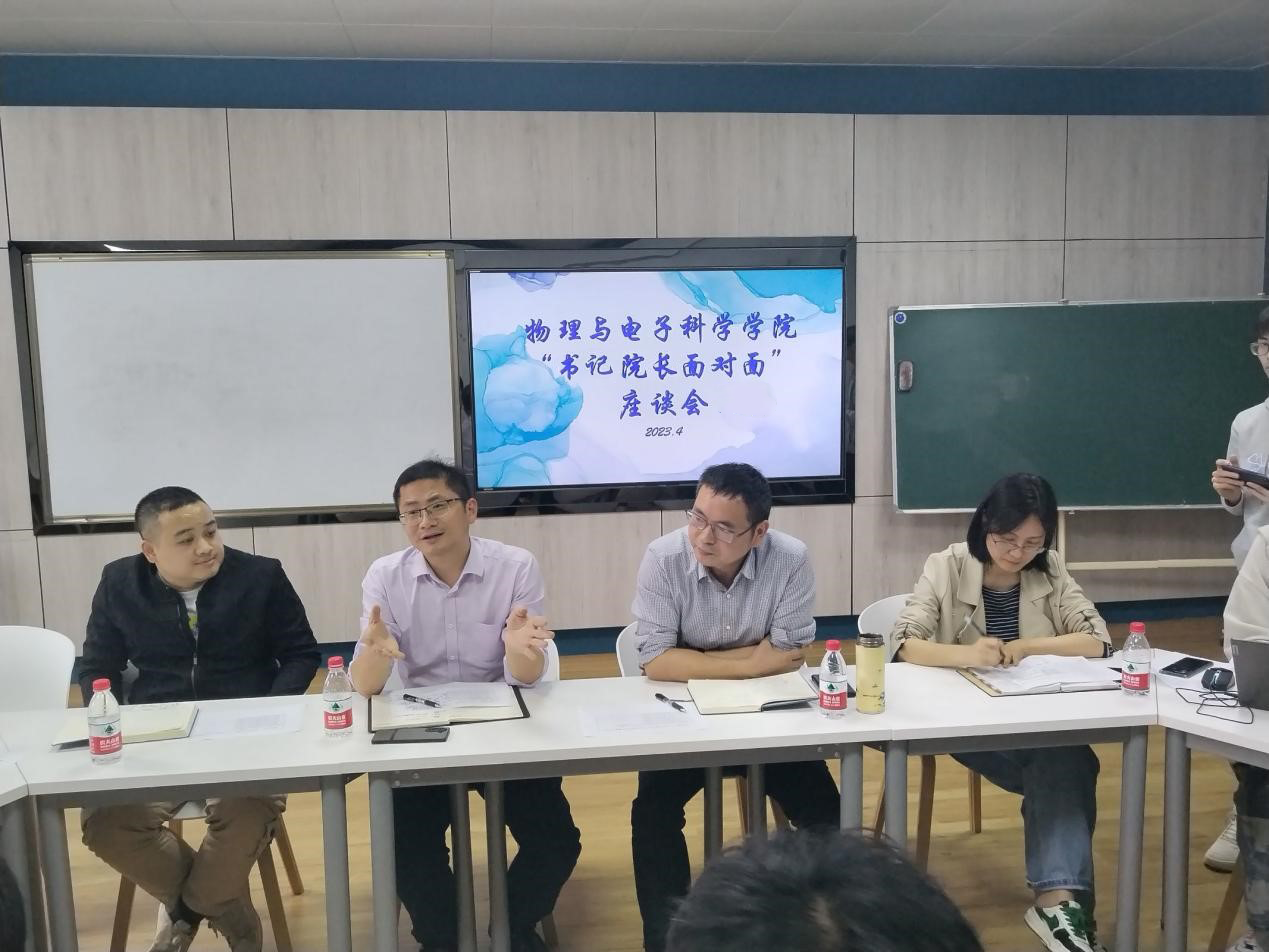 张卫兵副院长向同学们介绍了物电学院人才培养体系和学院特色专业优势,鼓励同学们要有专业自信,要努力提升能力、传承知识、健全人格,并对2019年新设的人工智能专业的考研方向进行了详细的讲解。张国强书记肯定了同学们心系学院发展、积极建言献策的主人翁精神,指出学生代表要切实发挥好桥梁纽带作用,把同学们的日常需求用正当渠道反映给学院,也要将学院的相关政策、举措及时传达给同学们,学院将根据同学们提出的意见、建议,及时反馈落实,在不断改进中夯实学生的教育、管理和服务工作,切实提升同学的满意度和获得感。