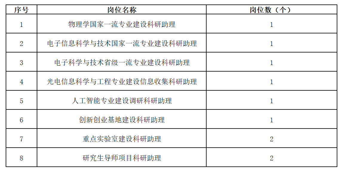 根据《省教育厅关于做好2023年开发科研助理岗位吸纳毕业生就业工作的通知》文件精神,结合学院实际岗位需求情况,现就2023年物理与电子科学学院科研助理岗位招聘事宜公告如下: