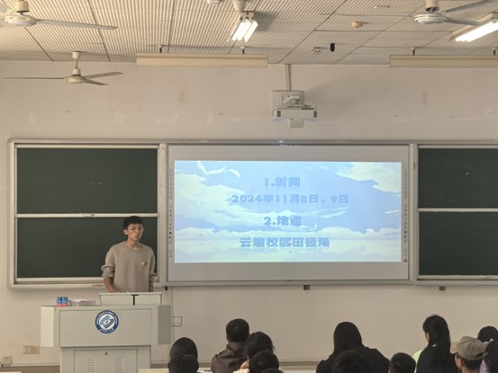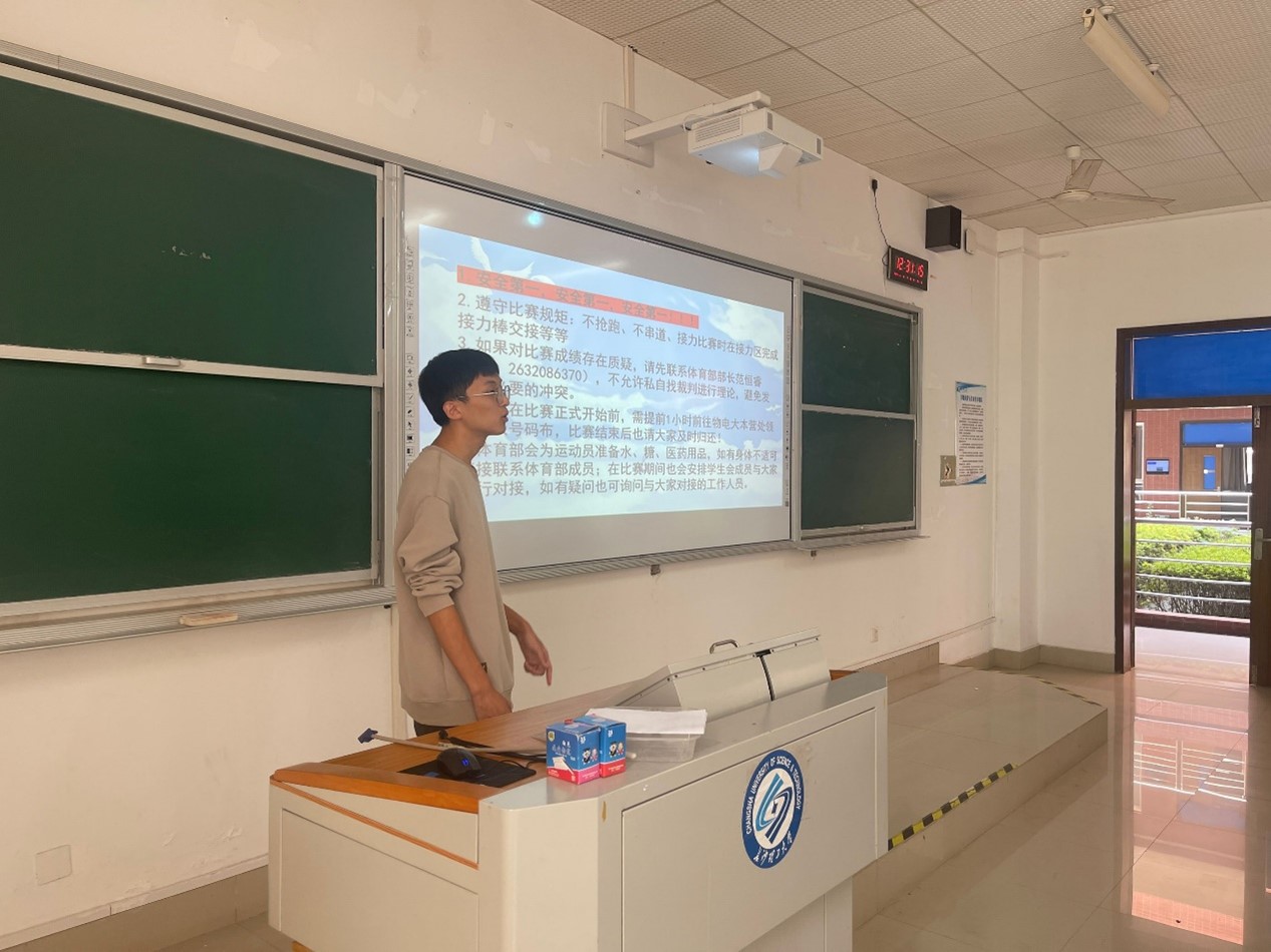 大会由体育部部长范恒睿主持,首先介绍了时间,地点安排。本次运动会将于2024年11月8日、9日在云塘校区田径场隆重举行,不仅是一次体育竞技的较量,更是学院精神风貌的集中展示。