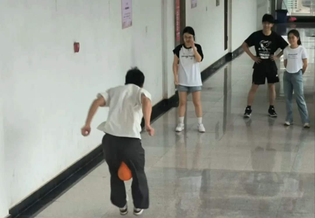 在“丑小鸭”赛跑游戏中,同学们通过石头剪刀布来自由组队,每组参赛者用膝盖夹住气球,进行接力赛跑,到达终点处,比赛过程中球不能落地,也不能夹破,若气球掉落或夹破,参赛者需要返回起点处。活动过程中,每组队员都在齐心协力给队伍指导和鼓励,参与者们“丑态百出”的赛跑模样引得在场每位同学捧腹大笑。
