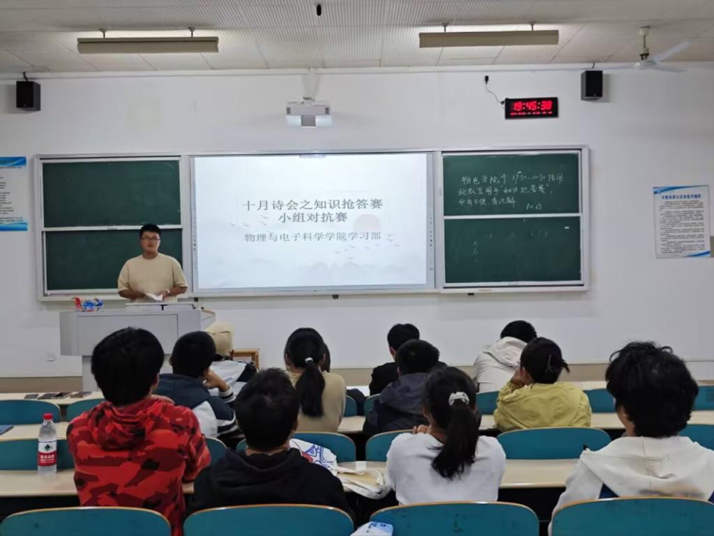 为了鼓励更多同学参与到诗歌与传统文化的学习中来,为中华优秀传统文化的传承与创新贡献青春力量。物电学院十月诗会系列活动之知识抢答竞赛和翰墨书法比赛成功举办。学习部分工合作,在完成出题、PPT制作以及相关通知后,于10月22日晚和10月25日晚举行了笔试预选赛和小组对抗赛。
