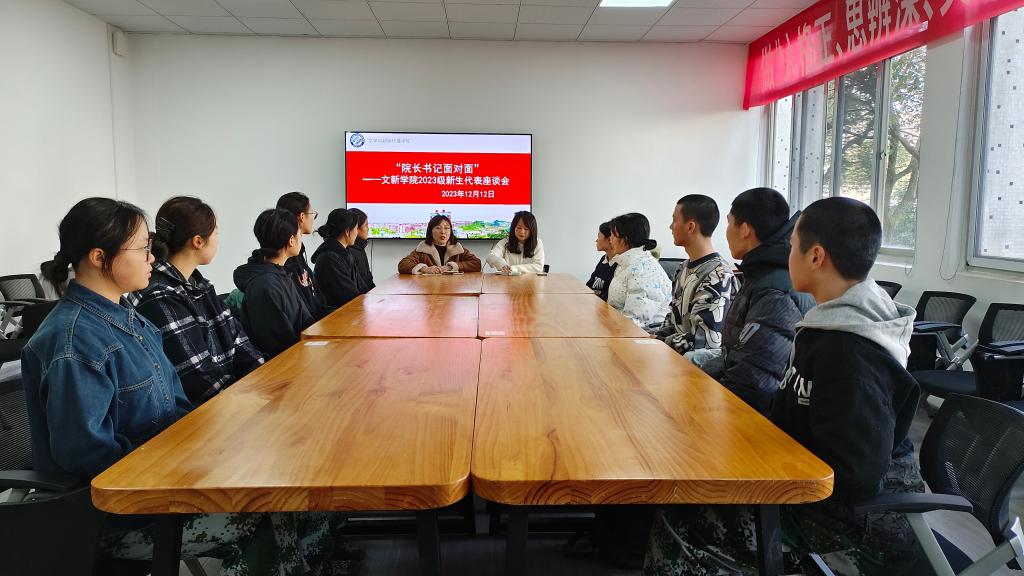 为了解学院同学在学习活动、日常生活及发展前景等方面存在的问题,12月12日下午,文新学院在九教院团委学生会办公室开展“院长书记面对面——2023级新生代表座谈会”。院党委副书记刘莎、23级辅导员李婵出席本次座谈交流会,学院12名新生代表参加会议。