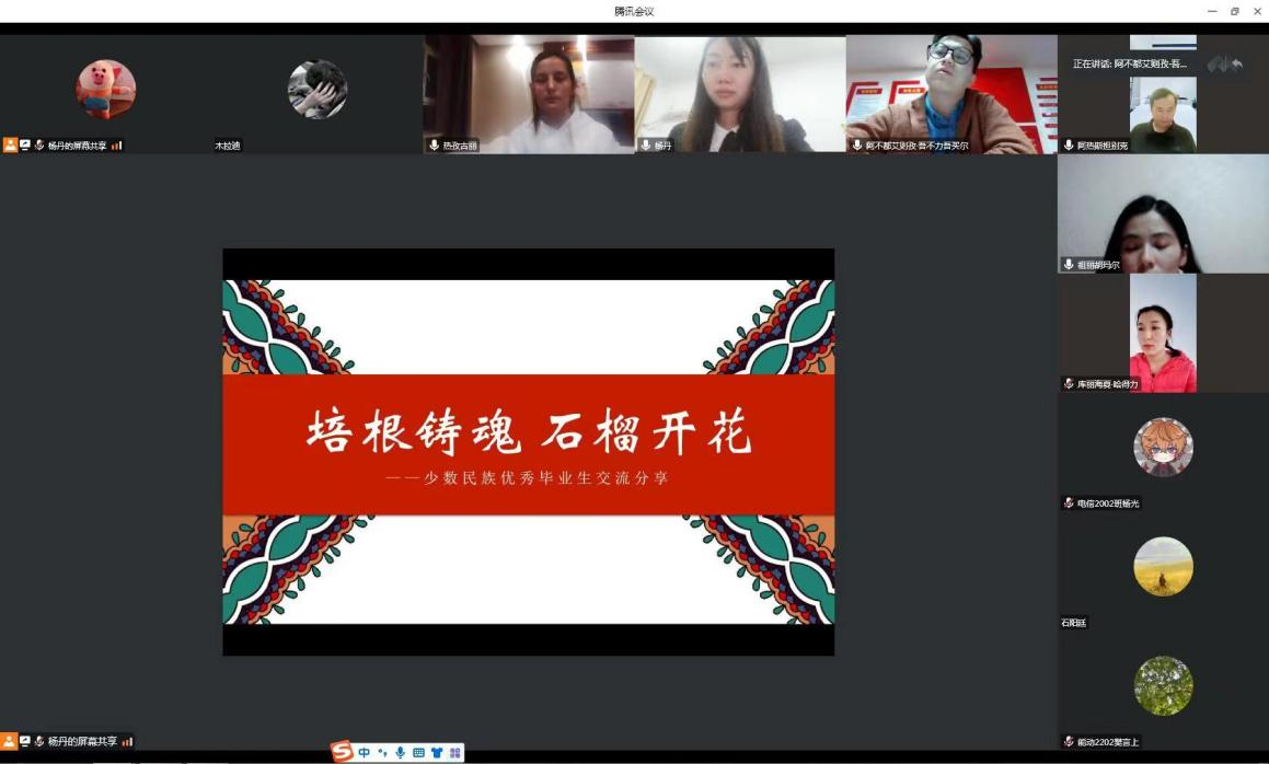 为进一步开展民族团结进步教育,加强人文关怀,助力少数民族学生成长成才,11月17日晚八点,我校线上举办少数民族优秀毕业生线上交流分享会。本次分享会由新疆派驻教师杨丹主持,学工部副部长闾兰、少数民族专职辅导员木拉迪·木合旦尔及及156名少数民族学生参加。