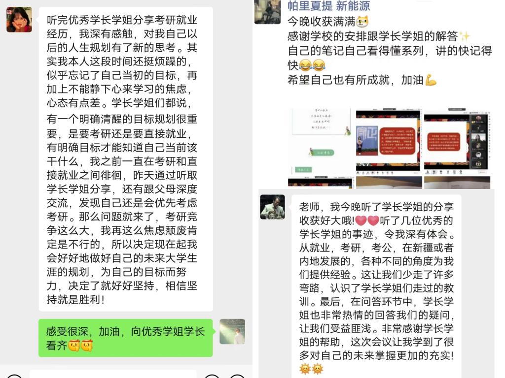 五位少数民族优秀毕业生结合自己的经历,娓娓道来,给了大家十分不一样的收获。2019届毕业生祖丽胡玛尔着重分享了自己的考研经验,强调了进入大学后一定要深入了解专业,夯实基础。2021届毕业生阿热斯担别克·热合木别克向同学们介绍了公务员、国有企业、国家电网的相关情况。2021届毕业生阿不都艾则孜鼓励学弟学妹们唯有不懈奋斗,方能不负青春。2020届毕业生库丽海夏讲述了自己参加司法考试、进行职业规划的心路历程。2021届毕业生热孜古丽从校园生活、择业、考研等方面跟大家谈了自己的经历和体会。大家认真聆听,在答疑环节争相提问,气氛十分活跃。