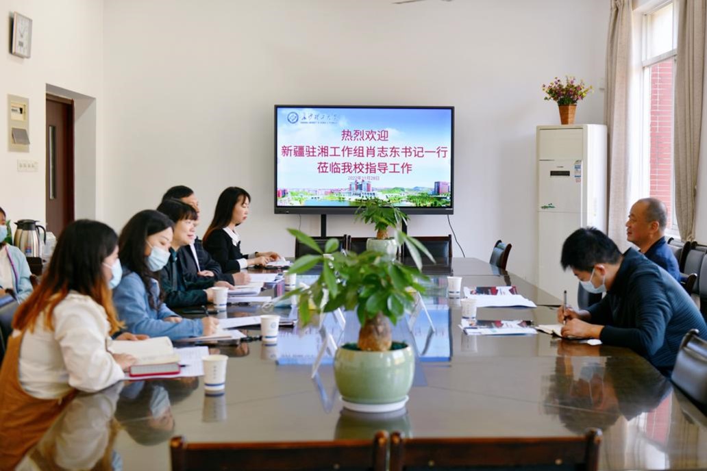 2022年11月28日,新疆驻湖南省工作组党委书记肖志东等一行人来校调研民族学生教育工作,了解我校民族工作开展及民族学生思想动态。我校副校长蒋璟萍,学生工作部部长邱国良及相关人员参会。