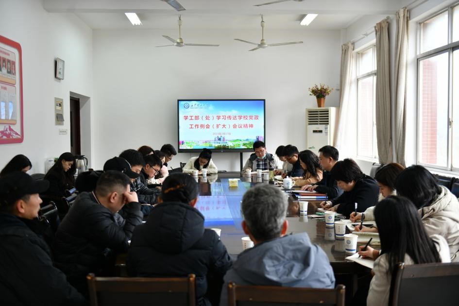 2月17日下午,学工部在学生活动中心401学习传达2023年第一次学校党政工作例会(扩大)会议精神,学工部部长邱国良主持会议,学工部全体工作人员参加学习。
