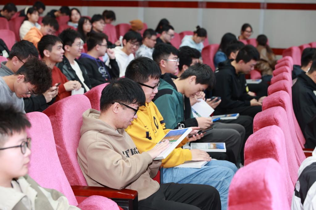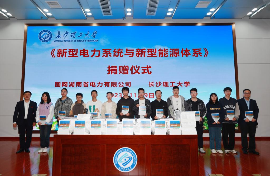 11月9日上午,国网湖南省电力有限公司党委宣传部副主任汤笛声一行5人代表电力公司向我校赠送了1000本《新型电力系统与新型能源体系》。校学生工作部部长邱国良、电气与信息工程学院党委副书记陶双和280余名学生参加了赠书仪式。