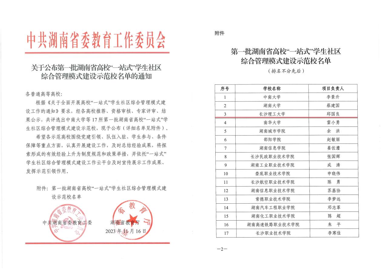 近日,中共湖南省委教育工委公布了第一批湖南省高校“一站式”学生社区综合管理模式建设示范校名单,共评选出17所建设示范校,其中本科院校7所,高职院校10所,我校成功获批为第一批“一站式”学生社区综合管理模式建设示范校。