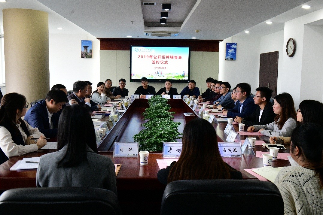 学校2019年新聘辅导员签约仪式于5月8日上午在云塘校区一办公楼五会议室举行。副校长谈传生、组织部、学工部(处)、团委、人事处、招就处、研工部、心理中心等部门负责人及全体新聘辅导员出席会议。会议由学工部(处)部(处)长艾楚君主持。