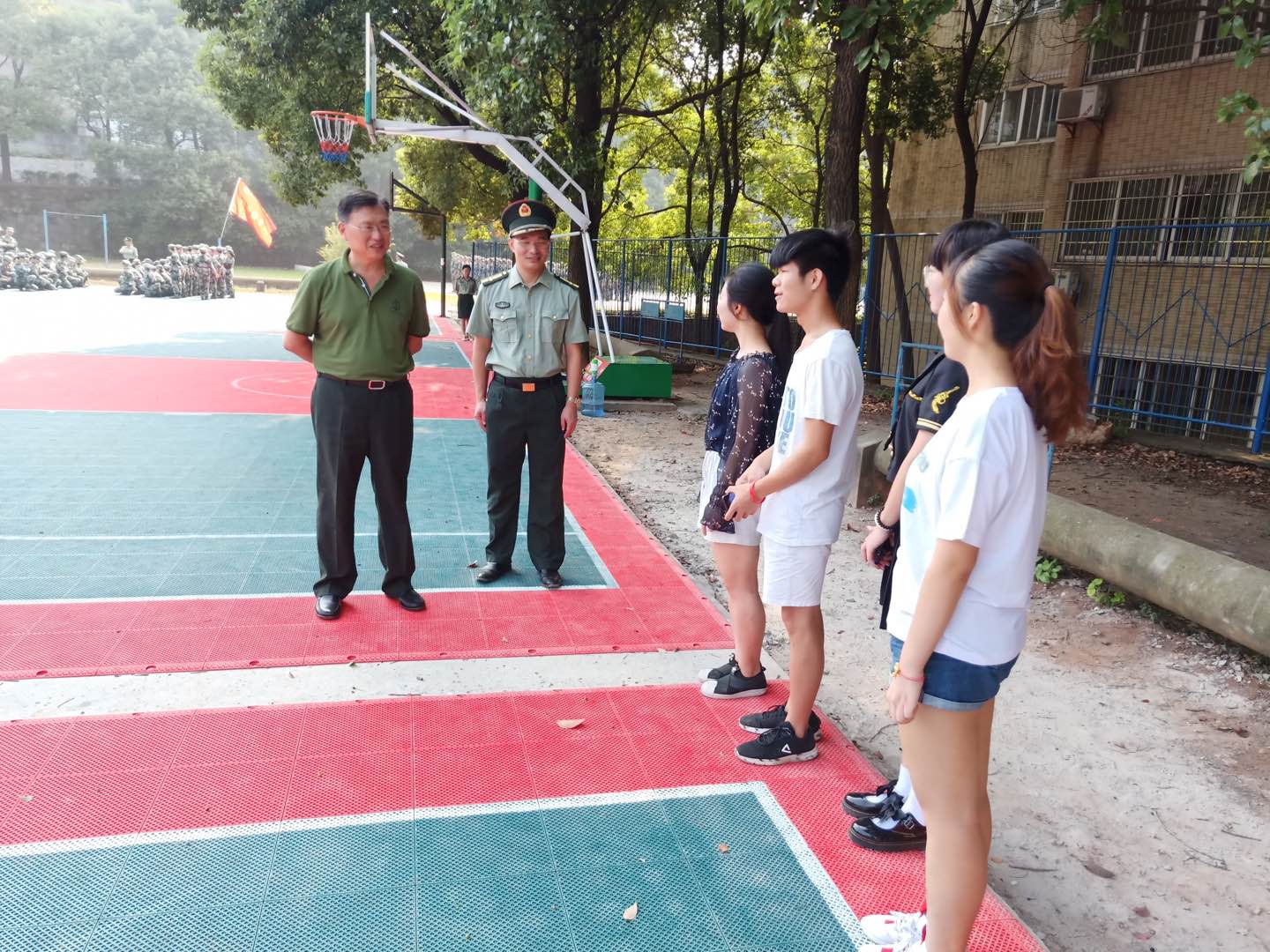 走进训练场地,谈传生亲切慰问了正在认真训练的各连队,并向各连指导员详细询问学生的军训情况。近日来,烈日高悬,但各连队依然以热情昂扬的斗志积极参加训练,校领导对学生饱满激昂的参训热情予以充分肯定,同时亲切叮嘱各连队队干部和学生都要注意保重身体、劳逸结合,以最佳的身体和精神状态完成军训工作。鼓励伤病连学生在自己力所能及的范围内为训练人员做好服务,并在以后学习生活中多锻炼身体、提高身体素质。
